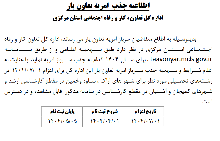 اطلاعیه جذب امریه تعاون یار ۱۱ تیر ۱۴۰۴ | ۱۲:۰۴ کد : ۵۲۷۴۸ اطلاعیه ارسال به دیگران نام شما ایمیل شما ایمیل دریافتکننده ارسال انصراف تعداد بازدید:۹۶۷ اطلاعیه جذب امریه تعاون یار